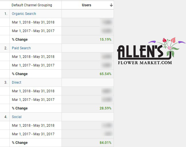 Allen’s Flower Market is a chain of family-owned and operated flower markets. For over 20 years, Allen’s has been delivering farm-fresh flowers to people locally and nationally. With numerous awards and great ratings and reviews, Allen’s is ready to grow even more. That’s when they contacted ASTRALCOM. The directive we received from Allen’s CEO was a very simple, “I want more!” So, together, we discussed a multichannel strategy that would help deliver more targeted customers to their website and to their brick-and-mortar locations. After a 3-month run, the channel traffic numbers – when compared to the same period in the previous year – are impressive: